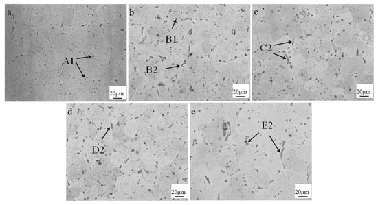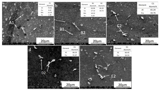 It can be seen from Figure 6 that when the heat input is 30 J/mm, in the deposit only the small-sized black phases were dispersedly distributed on the grain boundaries after heat treatment, as shown in A1 of Figure 6a. When the heat input reached 60 J/mm, in addition to the black phases, a small amount of gray irregular shapes were distributed on the grain boundaries, as shown in B2 of Figure 6b. When the welding heat input further increased, the number of irregular gray phases in the microstructure increased and the size increased, as shown in C2, D2, and E2 in Figure 6c–e. From the SEM and EDS of the deposits with different heat inputs, it can be seen that the small black precipitated phase is the remelted T phase, as shown in A1 of Figure 7a, and the irregularly shaped gray precipitated phase is the θ phase, as shown in B2 of Figure 7b. The θ phases were not completely dissolved in the matrix during the solid solution process. It can be seen from the SEM that when the amount of heat input is higher, the number of unsolved θ phases is higher after heat treatment, and their size is larger. This is because the higher the heat input, the size of the primary θ phase on the grain boundary is larger, and it is more difficult for it to dissolve in the Al substrate during solution treatment. The amount of Cu dissolved in the matrix directly determines the density, size and phase spacing of the main strengthening phase θ, during the aging process [19]. These undissolved θ phases have the effect of pinning grain boundaries when the size is small, but when the size is large as an intermetallic compound, it is the crack initiation position during fracture, which has a large negative impact on mechanical properties.