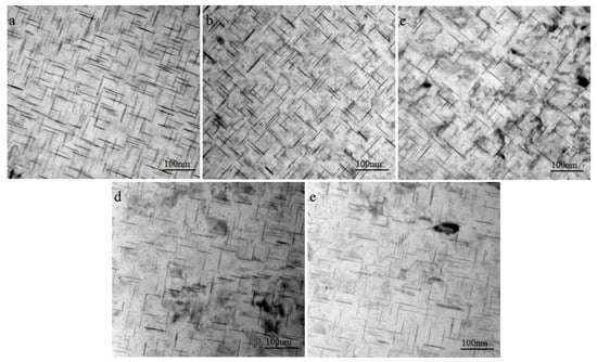Morphology of the strengthened θ’ phases of different heat input deposits at the peak aging state. (a) 30 J/mm; (b) 60 J/mm; (c) 90 J/mm; (d) 120 J/mm; (e) 150 J/mm.