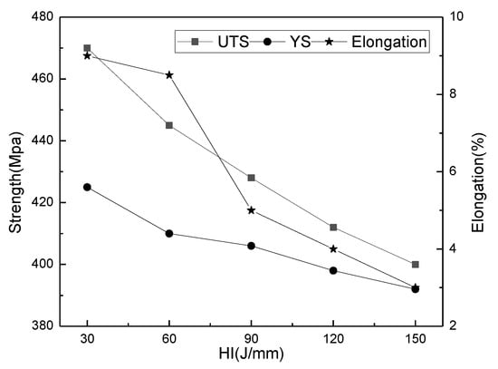 The mechanical properties of deposits with different heat input are shown in Figure 9. It can be seen from the figure that when the heat input is 30 J/mm, the mechanical properties of the deposit are: tensile strength: 470 Mpa, yield strength: 425 Mpa, elongation: 9%. With the increase of heat input, the mechanical properties of the deposits decrease significantly. The main reason is that with the increase of heat input, the grain size of the deposits increases, and the size of the precipitated phases increases, which leads to incomplete dissolution of the θ phase in the solid solution process. As a result, a smaller number of θ phases are precipitated during the aging process. When the heat input increases from 60 J/mm to 90 J/mm, the elongation decreases greatly, mainly due to the large number of pores present in the heat input = 90 J/mm deposit, which reduces elongation.