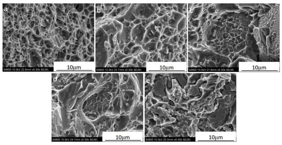 The fracture morphologies of different heat input deposits are shown in Figure 10. It can be seen from the figure that when the heat input was 30 J/mm and 60 J/mm, the fractures of the deposits were composed of a large number of dimples. The dimples were evenly distributed, the size was small, and the depth was large, indicating that the deposits have good toughness. When the heat input was increased to 90 J/mm, the size of the dimples increased and the depth decreased, which indicates that the toughness of the deposit is worse. At this temperature, the fracture mode of the deposit is still the ductile fracture. When the heat input reached 120 J/mm, in addition to the dimples, there were cleavage surfaces in the fracture. The fracture of the deposit is a mixed fracture. When the heat input was further increased to 150 J/mm, there were no dimples in the fracture, and the fracture mode was a brittle fracture. The change of the fracture mode of the deposits is mainly due to the number of grain boundaries and the width of the grain boundaries [22]. With the increase of heat input, the grain size increased, resulting in a reduction in the number of grain boundaries. The remaining precipitated phases after solution treatment increased the width of the grain boundaries, which resulted in a change in the fracture mode of the deposit.