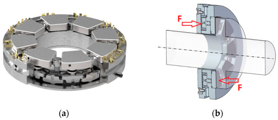 It often happens in real practice, especially in large rotary machines, that between stator and rotor necessary parallelism of active bearing and thrust collar is not guaranteed, what results in reduced bearing capacity. This misalignment can be caused by many factors (thermal dilatation, shaft misalignment, “inaccuracy” in production, etc.), the magnitude of which is dependent on the peripheral speed and the load [8]. The phenomenon of deflection of the shaft collar from the bearing axis during operation (up to several tenths of a degree) has been known for several decades, but at present, the only solution, that is capable to equalize misalignment between shaft and bearing axis, is the solution using the system of levers inside so-called a self-equalizing bearing, presented in Figure 1 [9,10].