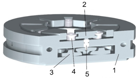 Figure 2. Self-equalizing bearing with levers (1—bearing body/housing, 2—thrust pad, 3—self-equalizing element (lever), 4—nozzle, 5—floating pressure element).
