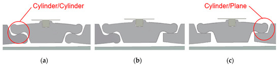 Figure 5. Variants of contact surfaces of lever, (a) Cylinder/Cylinder contacts on both sides of a lever, (b) Cylinder/Cylinder contact on the left side and Cylinder/Plane contact on the right side, (c) Cylinder/Plane contacts on both sides of a lever.