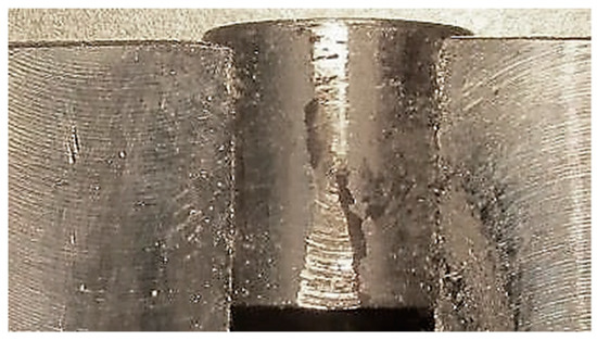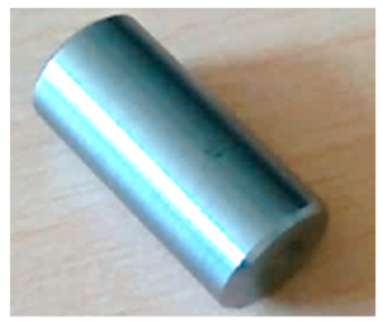 It would be unnecessary to produce complete levers for functional surface wear tests, and therefore, a simplified solution was adopted and the samples were designed in the form of a roller with the dimensions that corresponded to the rounded surface of the lever and in the form of a plate that represented the lever contact plane. Thus, in the experiment, the specimens had the shape of a 12 mm diameter cylinder and a 25 mm length, or a plate of 25 × 25 mm2, which correlated with the size of a lever for a reference bearing with 18 pads. An example of the cylindrical sample is in Figure 6.