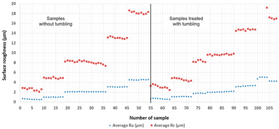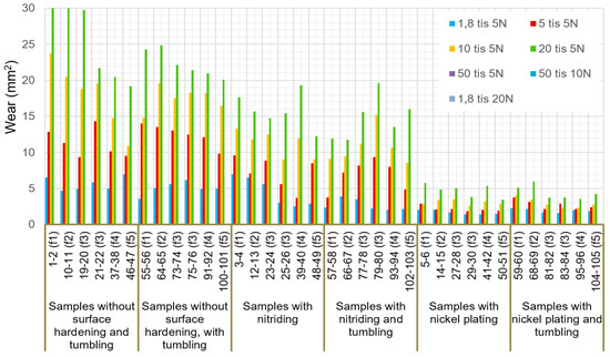 At the same time, due to the load requirements of the levers, it was necessary to harden the functional surface of the levers. Based on existing research, scientific studies [33,34,35,36,37,38,39,40] and practical applications, the electroless nickel plating and nitriding were chosen as technologies for a surface reinforcement to enhance the tribological properties of the levers. These technologies can be used as a final surface treatment after finishing without additional grinding. Tumbling on an OTEC DF3 machine (OTEC GmbH, Straubenhardt, Germany) was also used as an intermediate between possible surface hardening for half of the samples (Samples No. 55-108). After several tests, the following tumbling parameters were selected.