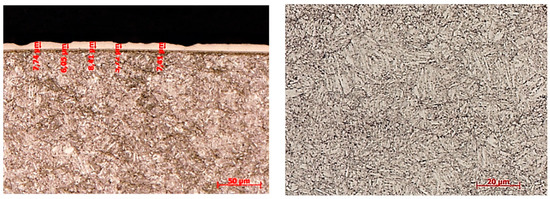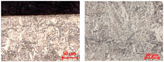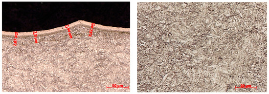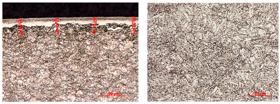 Figure 10. Nitrided sample—white layer thickness magnified 200× (left); sample centre magnified 500× (right).