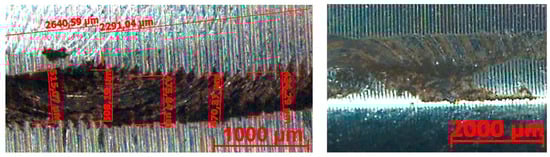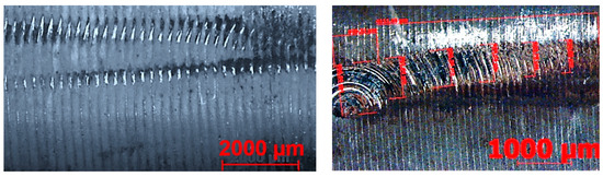 Figure 17. Sample No. 11—20× magnification, 1.8 × 103 cycles of 5 N load (left); Sample No. 55—10× magnification, 5 × 103 cycles, 5 N load (right).