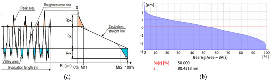 Figure 20. Abbott-Firestone’s curves, (a) construction according to the standard ISO13565-2:1996; (b) AFC obtained by means of software belonging to the Mahr MarSurf M300 device for sample No. 55.