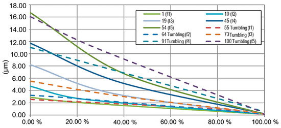 Figure 21. The bearing area curves of selected cylindrical samples (No. 1–54 without tumbling and No. 55–108 with tumbling).