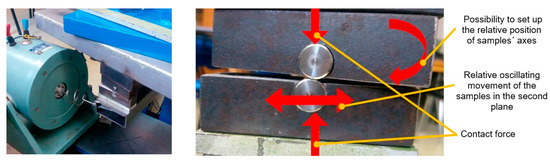 Figure 22. Frequency tribological testing device: Detail of adjustable holders and vibration exciter; (left), detail of samples positioning with the indication of movement possibilities (right).