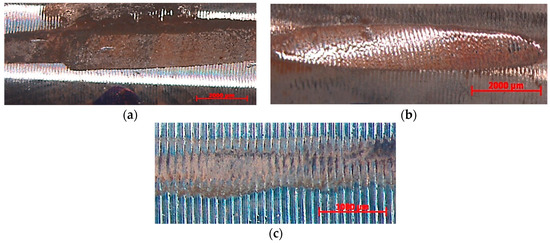 Figure 25. The example of wears of selected samples at tested configuration Cylinder/Cylinder. (a) Sample No. 10 without surface treatment (only heat-treated), 10× magnification; (b) sample No. 66 nitrided, 10× magnification; (c) sample No. 15 treated by electroless nickel plating, 10× magnification.