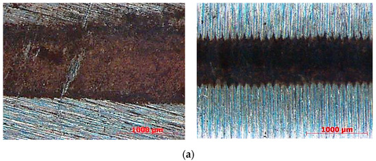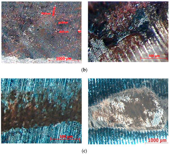 Figure 28. The example of wears of selected samples at tested configuration Cylinder/Plate. (a) Samples without surface treatment (only heat-treated): Plate No. 2—30× magnification (left); Cylinder No. 16, 30× magnification (right). (b) Nitrided samples: Plate No. 14—measurement of layer fragments, 30× magnification (left); Cylinder No. 17—detail of degradation of nitrided layer, 63× magnification (right). (c) Samples treated by electroless nickel plating: Plate No. 32, 40× magnification, (left); Cylinder No. 72, 20× magnification (right).