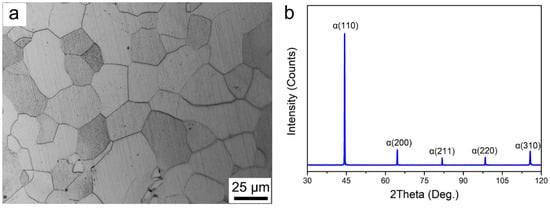 (a) Optical microstructure of the annealed 0Cr18AlSi steel and (b) corresponding X-ray diffraction pattern.