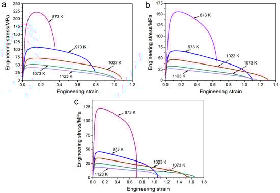 Tensile engineering stress–strain curves of the 0Cr18AlSi steel tested at various temperatures with strain rates of (a) 1.7 × 10−2 s−1; (b) 1.7 × 10−3 s−1; and (c) 1.7 × 10−4 s−1.