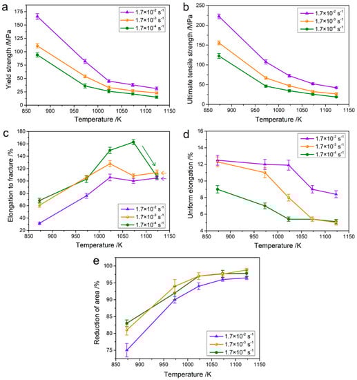 - The maximum elongation to fracture can be obtained at 1023 K for the strain rates of 1.7 × 10−3 and 1.7 × 10−2 s−1. The temperature for the maximum elongation to fracture is delayed to 1073 K when decreasing the strain rate to 1.7 × 10−4 s−1. The decrease in necking deformation resistance caused by fast migration of boundaries and uneven grain distribution results in the low ductility at high temperature of 1123 K.