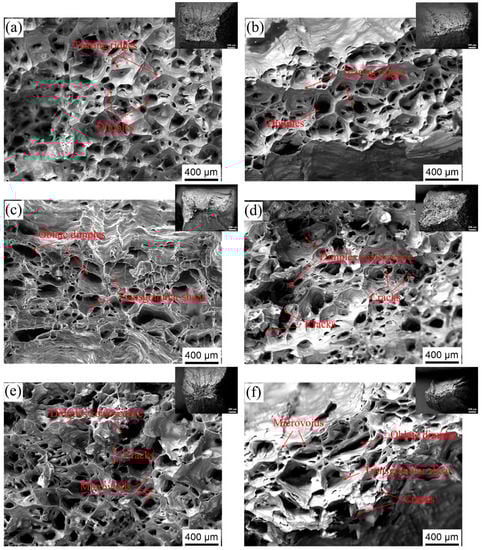 SEM fractographs of the 0Cr18AlSi steel tested at different conditions: (a) 973 K and 1.7 × 10−2 s−1; (b) 1023 K and 1.7 × 10−2 s−1; (c) 1123 K and 1.7 × 10−2 s−1; (d) 873 K and 1.7 × 10−4 s−1; (e) 973 K and 1.7 × 10−4 s−1; (f) 1073 K and 1.7 × 10−4 s−1. The insets indicated the fracture surfaces at low magnifications.