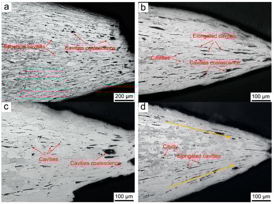The tensile behaviors are strongly connected to the microstructures. Figure 5 shows the optical micrographs of the cross-sectional area beneath the fracture surface for the specimen fractured under the typical conditions. The characteristics of microstructures and cavities can be observed. It is seen that at 873 K and 1.7 × 10−4 s−1 (Figure 5a), most grains are elongated parallel to the tensile axis due to the deformation of original grains, and a large number of small spherical cavities appear near the grain boundaries, particularly in the boundary junctions. These small cavities become coarser in the vicinity of the fracture due to their coalescence, eventually causing the material to break. As can be seen, the fracture experiences cavity formation, cavity coalescence, and crack formation and growth. As the temperature goes up to 1023 K (Figure 5b), the equiaxed grains can be found in the microstructure near the fracture apart from the deformed grains, indicating the formation of DRX. Moreover, the number of cavities is significantly reduced. However, these cavities preferentially nucleated at the boundaries of the new grains, and they are then elongated and expanded from the grain boundaries to interiors. This process can consume a large amount of deformation energy. Therefore, the necking deformation ability is improved when deformed at 1023 K. At the high temperature of 1123 K (Figure 5c), the grains are obviously coarsened due to the activation of boundaries migration, which indicates the dynamic softening is accelerated. However, the number of elongated cavities decreases. Plenty of spherical cavities and their coalescence in the vicinity of the fracture can be observed once again, which also indicates that the studied steel undergoes low necking deformation before fracture. With increasing the strain rate up to 1.7 × 10−2 s−1 at 1123 K (Figure 5d), the microstructure is refined obviously. It is noted that most elongated cavities distribute intensely near the upper and lower surfaces (marked the blue arrows). This because that a strong three-dimensional stress has formed at the necking area during the tensile test at high strain rates, which can promote the initiation and propagation of cavities.