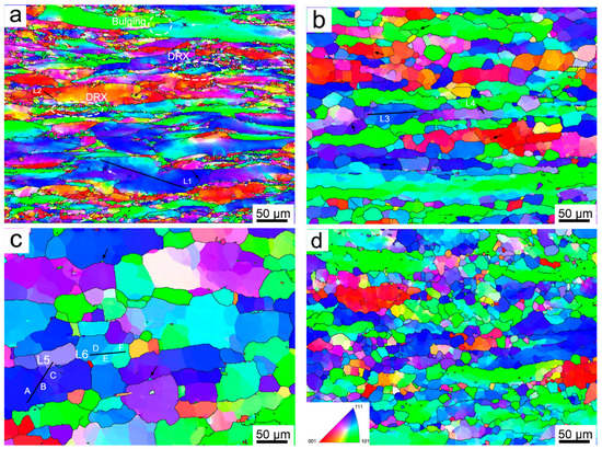 Inverse pole figure (IPF)-coloring orientation map for the 0Cr18AlSi steel tested under different deformation conditions: (a) 1.7 × 10−4 s−1 and 873 K; (b) 1.7 × 10−4 s−1 and 1023 K; (c) 1.7 × 10−4 s−1 and 1123 K; (d) 1.7 × 10−2 s−1 and 1123 K.