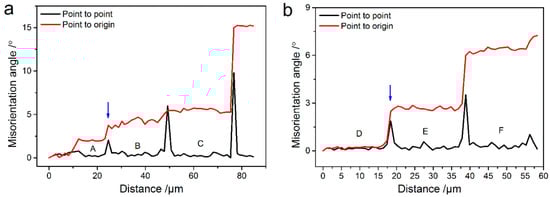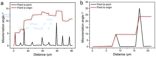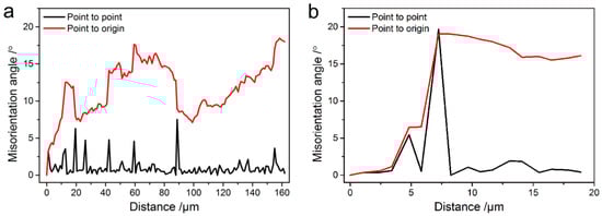 Misorientation profiles obtained along the lines marked in Figure 6a. (a) L1; (b) L2.