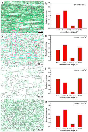 The distribution of grain boundary for the 0Cr18AlSi steel tested under different deformation conditions: (a) and (b) 1.7 × 10−4 s−1 and 873 K; (c) and (d) 1.7 × 10−4 s−1 and 1023 K; (e) and (f) 1.7 × 10−4 s−1 and 1123 K; (g) and (h) 1.7 × 10−2 s−1 and 1123 K. Green lines correspond to boundaries with low misorientation 2° < θ < 15°, and black lines θ > 15° represent high-angle boundaries.