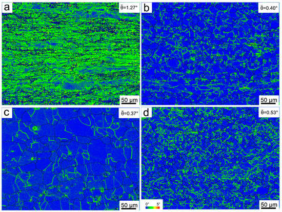Kernel average misorientation (KAM) maps for the 0Cr18AlSi steel tested under different deformation conditions: (a) 1.7 × 10−4 s−1 and 873 K; (b) 1.7 × 10−4 s−1 and 1023 K; (c) 1.7 × 10−4 s−1 and 1123 K; (d) 1.7 × 10−2 s−1 and 1123 K.