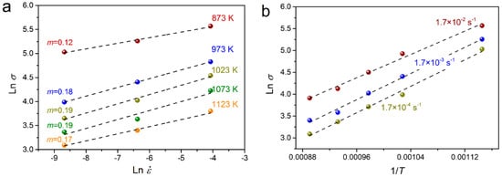 Here, the stable true stresses are taken from the flow curves. Remarkably, the n value can be obtained from the reciprocal of the slope of the linear regression line in the lnσ– plot at a particular temperature. In fact, such slope of the regressive line, the reciprocal of the stress exponent, represents strain rate sensitivity (m, m = 1/n). Ideally, a larger m value indicated a larger ductility and higher necking resistance [40]. Figure 12a shows the correlation between the flow stress and strain rate in a natural log. It is clear that at the low temperature of 873 K, m has the lowest value (~0.12), indicating a low ductility, which is consistent with the results in Figure 3c. While increasing the temperature, the value of m rises first and then declines. The maximum m value (~0.19) can be obtained at temperatures between 1023 and 1073 K. After averaging the m values, the stress exponent is estimated to be 5.9. It is accepted that, when n = 4–6, the motion of dislocations controlled by climb would be the dominant deformation mechanism [42].