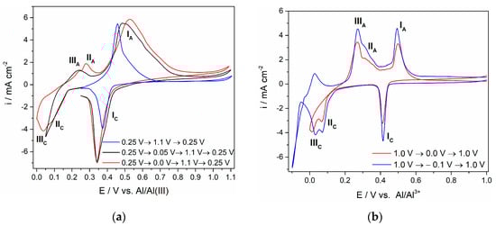 Voltammograms with a Ti working electrode in an equimolar AlCl3-NaCl melt (T = 200 °C, v = 20 mV·s−1): (a) potential changes during the first cycle from a starting point (EI = 0.250 V) to an anodic potential limit (EA = 1.100 V) and then back to 0.250 V and potential changes during the second and third cycles starting from EI = 0.250 V to different cathodic potential limits EC, then to EA and finally to a value EF = 0.250 V; (b) potential changes during cycles from a starting point (EI = 1.000 V) to different cathodic potential limits and back to a final value (EF = 1.000 V).