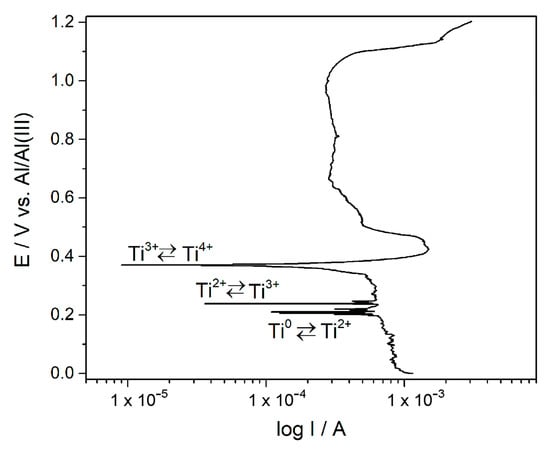 It was found that in the presence of aluminium ions in the equimolar chloroaluminate molten salt electrolyte, the electrochemical reduction of titanium ions to metallic titanium was complicated by the formation of intermediate oxidation states of Ti4+, Ti3+ and Ti2+ [1,3]. These were recorded as cathodic peaks IC (Ti4+/Ti3+), IIC (Ti3+/Ti2+) and IIIC (Ti2+/Ti) and their respective anodic counterparts IA, IIA and IIIA, shown in Figure 1. These observations were similar to the results reported on Pt and Ti electrodes from an AlCl3 + N-(n-butyl)pyridinium chloride (mole ratio: 2:1) melt at 25 °C [23]. The potentials related to these processes can be read from voltammograms. Their values greatly depend on temperature, the composition of electrolytes and concentrations (amounts) of dissolved titanium ions in the melt [1,3,10,13,14,15,24]. In the equimolar AlCl3-NaCl melt used, the average recorded values of the reversible potential for the pairs Ti4+/Ti3+, Ti3+/Ti2+ and Ti2+/Ti were approximately 0.410, 0.190 and 0.149 V. However, they can be identified also from the potentiodynamic polarization curve of titanium recorded in the used melt at 200 °C (Figure 2). It is apparent that the potentials designated as ≈ 0.200 V, ≈ 0.240 V and ≈ 0.370 V are in reasonably good agreement with the reversible potentials determined by the peak pairs IC/IA, IIC/IIA and IIIC/IIIA from the voltammograms in Figure 1.