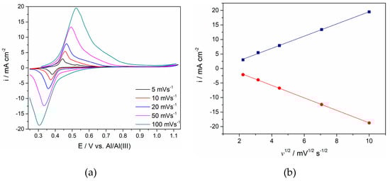 (a) Voltammgrams of the Ti working electrode in the equimolar AlCl3-NaCl melt at T = 200 °C with different sweep rates; (b) plots of anodic and cathodic peak current densities vs. square root of scan rate calculated from (a).
