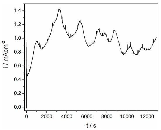 Taking into account the voltammograms obtained in the system used (Figure 1), the electrodissolution of titanium was done potentiostatically at 0.500 V and 200 °C and at 0.450 V and 300 °C (Figure 4). The chosen anodic potentials were sufficient enough compared to the reversible potential of the Ti3+/Ti4+ redox couple to sustain titanium dissolution at a current density of around 1 mA·cm–2. The alternate rise and drop of the dissolution current recorded in Figure 4 is due to processes of dissolution-precipitation reactions on the electrode surface at a working potential applied. Similar effects at potentials, which were anodic but close to the Ti2+/Ti3+ reversible potential, were addressed in the literature [1,3] and were attributed to the precipitation of a Ti3+ product, while the breakdown of a passive film was positioned at potentials, where Ti4+ species generation started, i.e., at potentials close to the Ti3+/Ti4+ reversible potential.