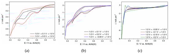 Voltammograms of the glassy carbon (GC) working electrode in the equimolar AlCl3-NaCl melt containing anodically dissolved Ti, obtained at different cathodic potential limits and at T = 200 °C with different sweep rates: (a) ν = 5 mV·s−1; (b) ν = 20 mV·s−1; (c) ν = 5 mV·s−1.