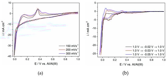 Voltammograms obtained on the GC working electrode in the equimolar AlCl3-NaCl melt containing anodically dissolved Ti at T = 300 °C on different conditions: (a) potential change: EI = 1.000 V to EF = 0.0 V with different sweep rates; (b) at different cathodic potential limits at a constant sweep rate ν of 50 mV·s−1.