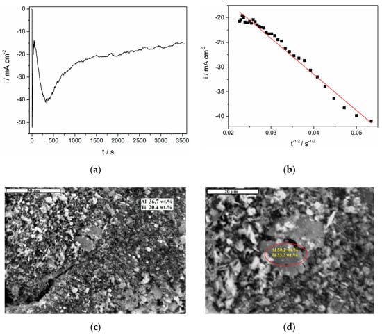 Potentiostatic deposition on the GC working electrode from the equimolar AlCl3-NaCl melt containing anodically dissolved Ti at −0.085 V and 200 °C for two hours: (a) current–time transient of the deposition; (b) current as a function of t−1/2 for the falling part of the transient in (a); (c,d) SEM photographs of the deposit obtained with energy-dispersive spectroscopy (EDS) results embedded.