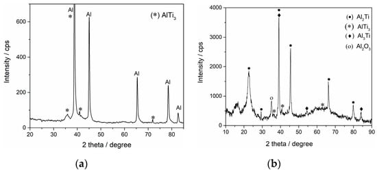 Intermetallic materials based on a combination of aluminium and titanium, which possess high specific strength and low weight and required stiffness and excellent oxidation resistance at elevated temperatures (particularly over 600 °C), are of increasing importance as new structural materials in aerospace industry and medicine [1,2,3]. Due to its ability to increase the temperature of titanium allotropic transformation, aluminum is the main alloying element for titanium. The density of aluminum is less than the density of titanium, so the addition of aluminum increases the specific strength of Ti alloys. High functional properties make the Ti-Al system the foundation of many titanium alloys. The presence of thermodynamically stable intermetallic phases in titanium-aluminum composite materials allows for and significantly enhances physical and mechanical characteristics of these systems [4].