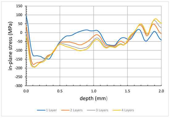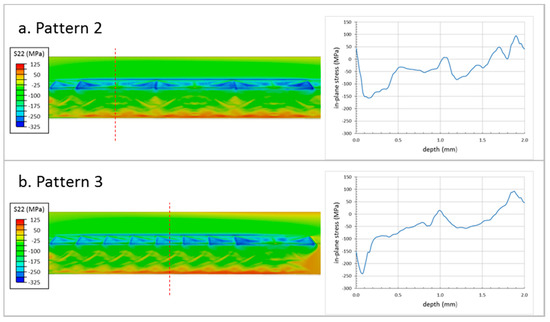 Effects of peen layering on predicted in-plane residual stress: (a) Pattern 2; (b) Pattern 3. The patterns are shown in Figure 10.