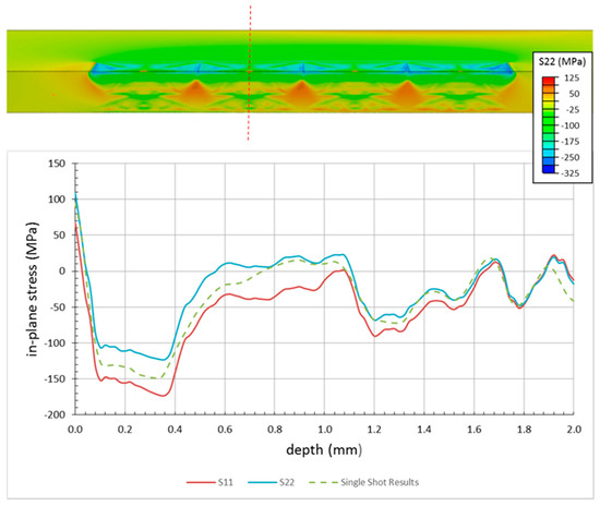 Figure 7 also compares the through-thickness profiles for the in-plane stresses taken parallel to (S11) and transverse to (S22) the peen line; as is shown, the stress states in the two directions are noticeably different, with as much as a 50 MPa variation in some locations. In general, the stresses transverse to the peened line are less compressive (or more tensile) than those in the longitudinal direction. This could pose a concern for certain applications in which the peen line was designed to overlay a surface scratch. Because the stresses are of lower magnitude (or even more tensile) in the critical direction (i.e., the direction that would tend to encourage crack formation and opening), the true potential of the LP treatment would not be realized, and could even exacerbate the situation. It should also be noted that through the spot centers, the stresses transverse to the peen line are generally more tensile than those predicted by single shot simulations.