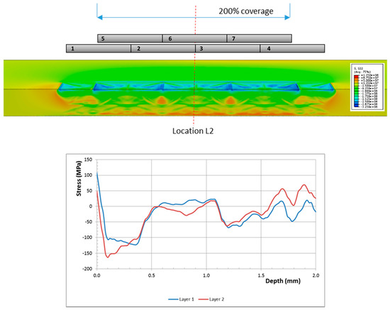 As was the case for single shots, augmenting the peen line with additional layers can help alleviate the surface tensile stresses at the spot centers. In Figure 8, second and third layers of peen spots are applied along the peen line at a 50% offset between one layer and the next, as shown in the schematic. The line plots illustrate the in-plane stress through the center of a spot on the topmost layer (denoted Location L1). Similar to the case of a single peen spot, the surface tensile zones in the spot centers are reduced as additional layers are applied; however, the effects of adjacent spots are very apparent. A second layer flips the surface stress to compression (from 108 MPa to −243 MPa) while a third layer flips it again (from −243 MPa to 46 MPa). The end result is that although the stress at this location is reduced with additional peen layers, shallow tensile regions—about 20 μm deep and 20 μm in width—persist in the center of each spot that comprises the topmost layer of the plate.