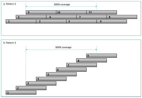 Schematics for achieving 300% peen coverage: (a) Pattern 2; (b) Pattern 3. Figure 8 shows Pattern 1.