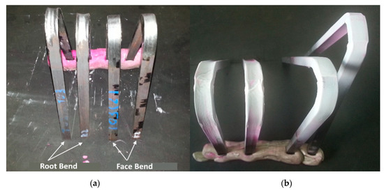 Samples subjected to bending tests: (a) samples bent in face and root surfaces, and (b) liquid penetrant technique applied to bent samples.