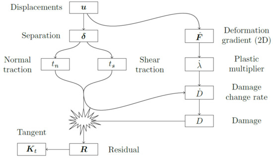 Based on the deformation gradient a variety of material models can be applied; here the Lemaitre model is used. The plastic multiplier as amount of (plastic) deformation can be computed (right in Figure 4). Together with tractions from the traction separation relation (left) a damage rate () results. Accumulation of the damage (or certainly high tractions and ) might then cause interruption of the cohesion.