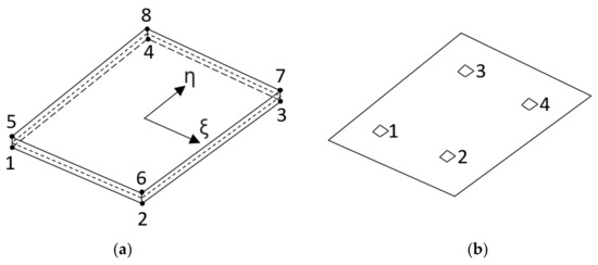 Marc is a nonlinear finite element solver from MSC Software (MSC Marc Mentat 2019 Feature Pack 1, Newport Beach, CA, US). The pre- and postprocessor Mentat, also from MSC Software, allows to setup simulations for Marc. Linear and quadratic Cohesive Zone Elements are provided by the software package [7]. Figure 5 shows the connectivity (a) and Gauss integration points (b) of element 188. The connectivity corresponds to a brick element, though the thickness in one direction is (initially) zero so the geometry complies with a quadrilateral element. As integration is only executed in the cohesive surface (dashed midplane, Figure 5a), a Gauss integration scheme contains only points like a quadrilateral element. Wedge or triangle like element types and Newton Cotes integration schemes are also available. The degrees of freedom are displacements in three directions. In case of a thermomechanical analysis a weak coupling is realized with a staggered approach, i.e., a separate thermal element is used additionally to the mechanical element (e.g., the thermal element 222 corresponds to the mechanical element 188).