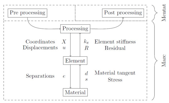 Figure 6 shows the analysis path from pre- to postprocessing; element and material subroutines are drawn as sub steps of processing to discuss the implementation that interacts here. During processing, coordinates and displacements are handed over to the element subroutine. In the case of cohesive elements, separations are computed and the material subroutine is called. The material subroutine returns a tangent and stress. This is processed in the element subroutine to an element stiffness matrix and a residual.