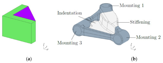 The transverse link is an advanced demonstrator component for Tailored Forming. All processes and also the final geometry are currently under development. The raw hybrid part is produced by extrusion; a forging process and afterwards machining is used to generate the final geometry. According to the current state, the raw part is an L formed steel profile (32 mm × 32 mm, width = 7 mm) that is filled with aluminium (Figure 7a). The final geometry is flattened, contains an indentation in the middle and has three holes for mounting (Figure 7b).