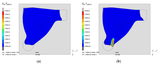 The process can now be executed further. Though filling the edge around mounting 1 (Figure 7b) causes severe difficulties. The stronger steel and a thin portion of the weaker aluminium enter the groove and come into contact on both sides (Figure 13a). Further forming induces compression, the aluminium starts yielding normal to the compression direction and decohesion is caused by shearing (Figure 13b). The decohesion induces a reduced heat flow that results in a temperature jump, see Figure 14. Using an adapted temperature range (Figure 14b) the effect can be noticed better compared to the plot with the whole temperature range (Figure 14a).