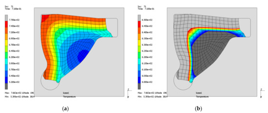 Forming process using a further simplified geometry; whole (a) and adapted temperature range (b): temperature distribution.