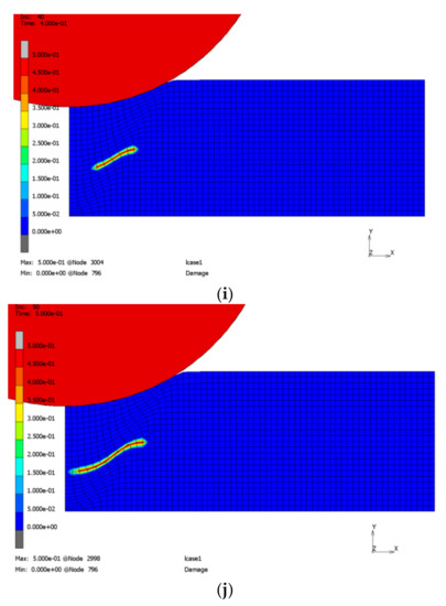 Figure 16 shows some increments of the simulation using a fine mesh. Predamaging, failure, and successive delamination can be observed. The contact algorithm adopted from [5] maintains a certain stiffness in normal direction only for compression. Therefore, penetration after failure is prevented but tangential sliding occurs.