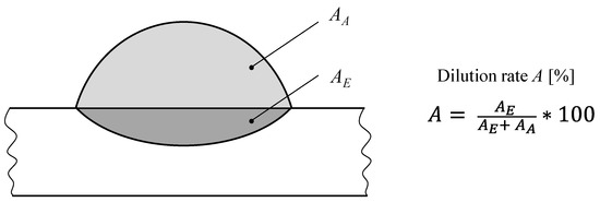 For metallographic investigations, three cross sections per sample were extracted at a weld seam length of 40, 50, and 60 mm and finally ground as well as polished in a multi-stage procedure. Macroscopically, the dilution rate, A, was of interest; see Figure 2.