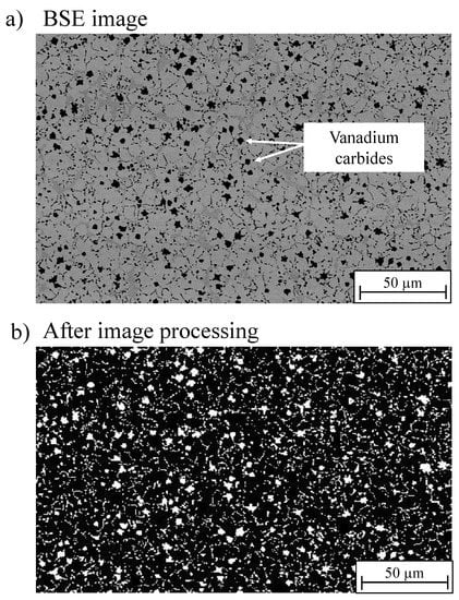 A MATLAB-based image processing tool (The MathWorks, Natick, MA, USA) was applied to determine the percentage of VCs in the matrix material; this enabled the selective detection of pixels with different brightness intensities. BSE images with a magnification of 500 were used; see Figure 3.