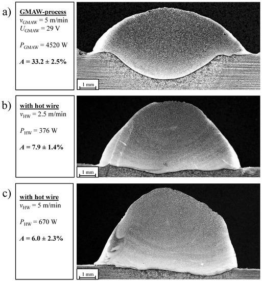 The influence of the additional hot wire during GMAW of FeV12 is depicted in Figure 4. The conventional GMAW with a wire feed rate, vGMAW, of 5 m/min and a welding voltage, UGMAW, of 29 V serves as a reference. According to Figure 4a, conventional GMAW is characterised by a dilution rate, A, of ~33%. A steady increase in the material input via the hot wire results in a decrease in the dilution rate, A, from ~33 to ~6%; see Figure 4b,c. At the same time, the deposition rate doubles.