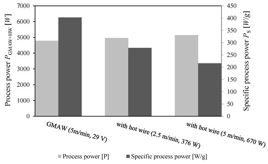 The reduced dilution rate can be correlated with the decrease in the specific process power, PS. Because the hot wire power, PHW, equals 15% of PGMAW, so as to fuse the filler wire at wire feed speeds, vGMAW and vHW, of 5 m/min, the specific process power, PS, is reduced from ~400 to ~215 W/g; see Figure 5.